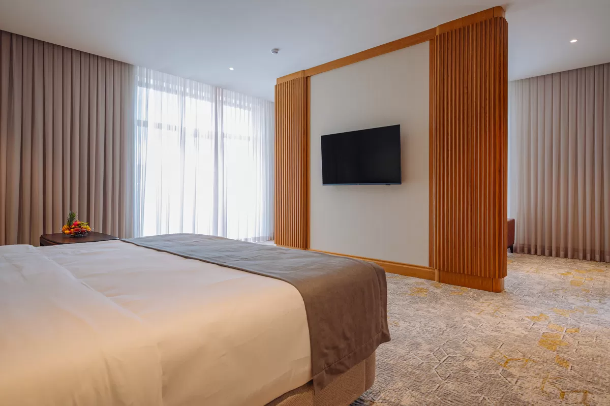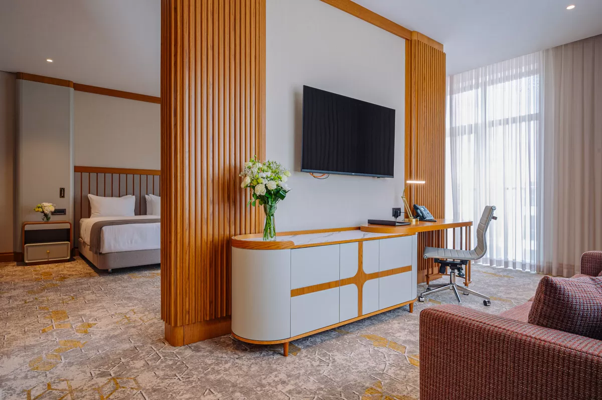 Пространство визуально разделено мини-стеной на две зоны - для сна и досуга. В гостиной находятся удобный раскладной диван, комод и рабочий стол с креслом. В спальне стоит большая кровать с ортопедическим матрасом, рядом установлены персональные прикроватные тумбочки. В каждой комнате установлены широкоформатные ЖК-телевизоры. Лаконичный интерьер дополнен стильным декором.