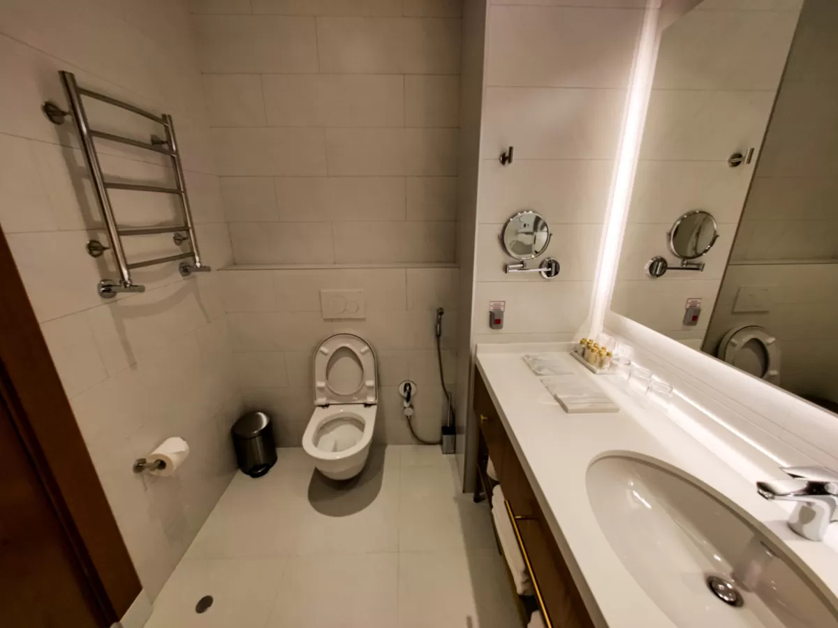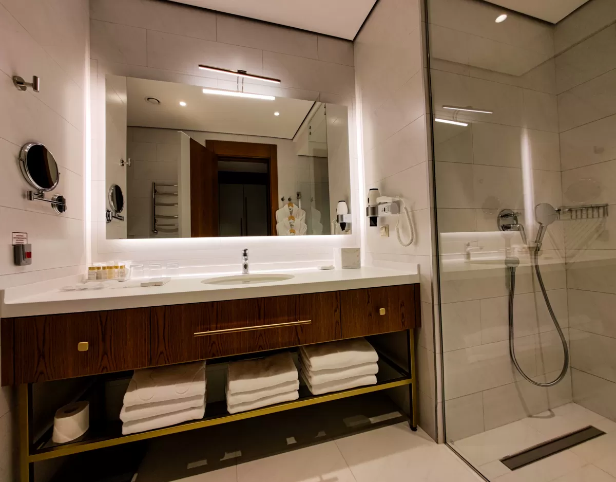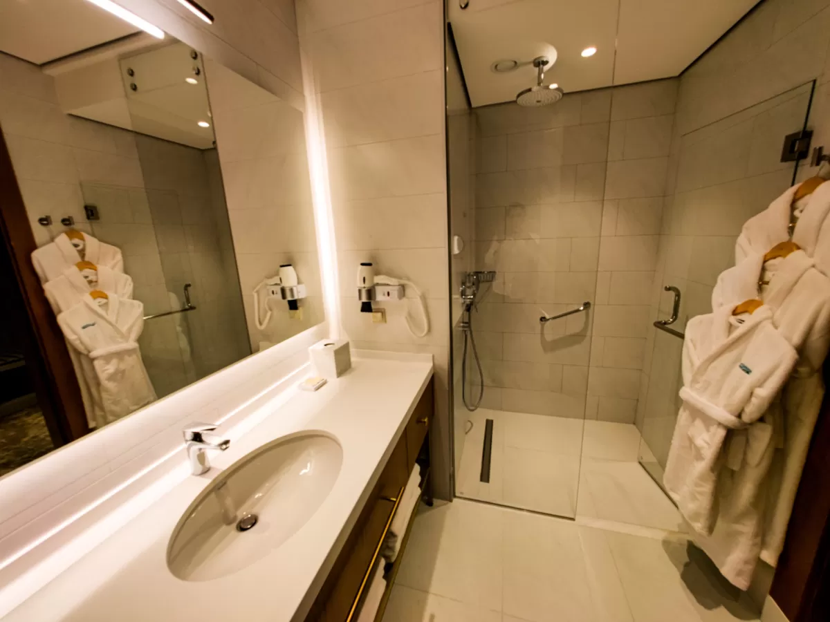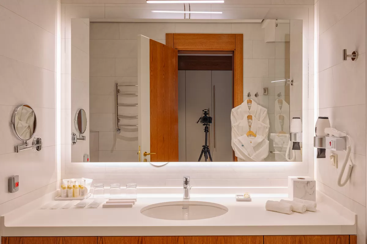 В прихожей расположен шкаф-гардеробная. А в совмещенной уборной имеются душевая кабина, раковина с ящиками и унитаз. Там же для каждого гостя подготовлены индивидуальные наборы для водных и гигиенических процедур - полотенца, моющие и косметические средства, фен, халаты и тапочки.